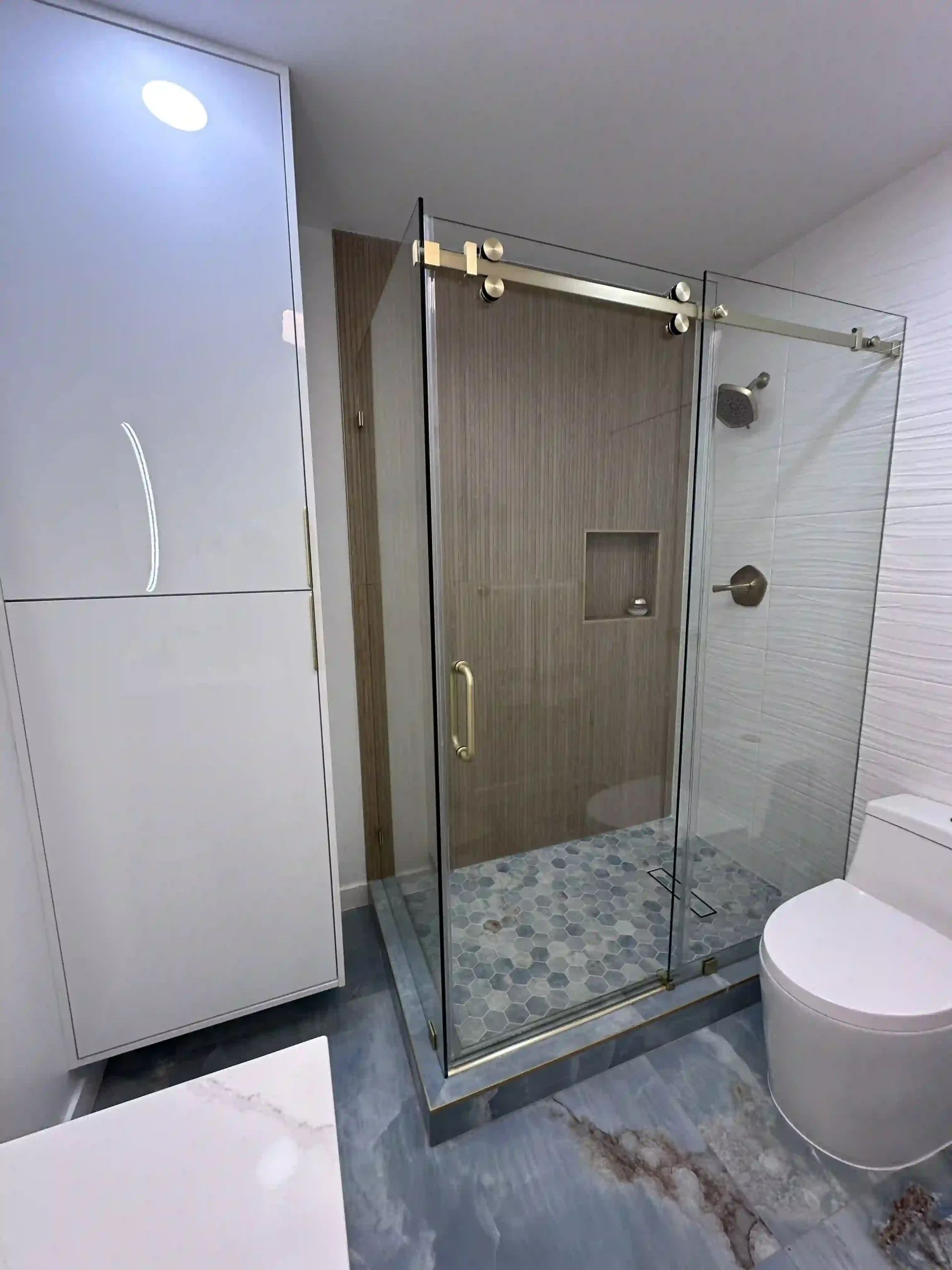 Vanity installations, shower doors, tubs, and complete or partial bathroom remodels.
